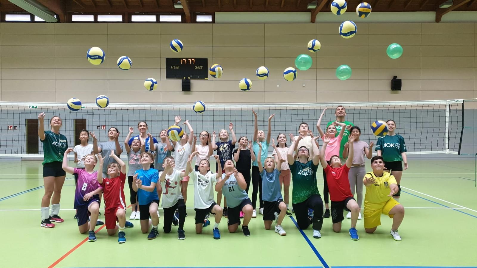 Am Freitag, den 04.07., startete unsere Minivolley-Trainingsgruppe für Kinder zwischen 7-9 Jahren mit einem offenen Schnuppertraining. Bereits für diesen allerersten Termin kamen 14 Kinder in die Halle, um spielerisch Bewegung und Koordination mit dem Ball zu üben und schon die erste Volleyball-Technik, das Pritschen, auszuprobieren. Dabei übten und spielten die Kinder unter der Anleitung unserer Minivolley-Trainerin, Julia A. , die von unserer U13-Trainerin Julia P. und unserer U16-Trainerin Francesca unterstützt wurde. Die erste Pritsch-Einheit der Kinder wurde von A-Trainer Jean übernommen, der eindrucksvoll zeigte und erklärte, wie die Technik später aussehen soll. Schnell lernten die anwesenden Kinder, dass das wichtigste Ziel beim Volleyball ist, den Ball in der Luft zu halten – was sich als gar nicht so einfach herausstellte. Dennoch konnten alle Anwesenden mit Erfolgserlebnissen und ersten Fortschritten die Halle verlassen. Als Abschluss für dieses gelungene erste Training gab es ein Eis für alle Teilnehmer und Trainer, danke für eure tolle Arbeit! Das Minivolley wird ab nach den Sommerferien immer freitags 17-18 Uhr in der SpiZ in Freiberg stattfinden. Kinder zwischen 7-9 Jahren sind nach Anfrage über das Kontaktformular auf unserer Webseite herzlich willkommen. Wir freuen uns auf eure Anfragen und neue Gesichter!