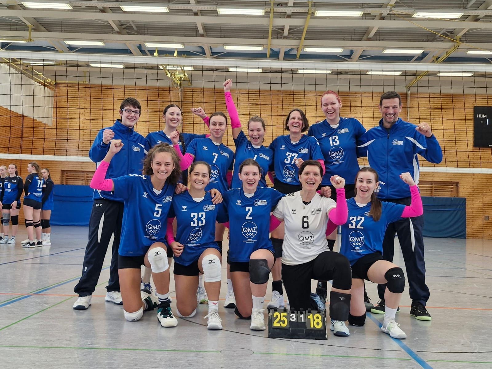 Am vergangenen Wochenende stand für die Damen des SGV Freiberg der erste Heimspieltag in der Bezirksliga an. In der gut gefüllten SpiZ traf das Team zunächst auf den SV Fellbach 3. Nach einem wechselhaften Spielverlauf konnten sich die Freibergerinnen schließlich mit 3:2 (22:25, 25:8, 18:25, 25:9, 15:4) durchsetzen. Der Start verlief holprig: Im ersten und dritten Satz besiegte sich der SGV phasenweise selbst. Viele Eigenfehler und Abstimmungsprobleme prägten das Spiel, während Fellbach mit starker Abwehrarbeit dagegenhielt. In den gewonnenen Sätzen zeigte sich jedoch die ganze Stärke der Freibergerinnen – druckvolle Aufschläge, klare Angriffe und eine konzentrierte Mannschaftsleistung führten zu einstelligen Satzgewinnen. Beim Stand von 1:2 in Sätzen drehte sich das Spiel schließlich: Maya setzte die Fellbacherinnen mit starken Aufschlagserien unter Druck und Vika glänzte durch zahlreiche Angriffspunkte. Die SGV-Herren, die zuvor selbst zwei Heimspiele bestritten hatten, blieben zum Anfeuern in der Halle und sorgten gemeinsam mit dem Heimpublikum für eine großartige Stimmung. Angetrieben von dieser Unterstützung fand unser Team zu seiner Dominanz zurück und entschied das Spiel souverän für sich.
